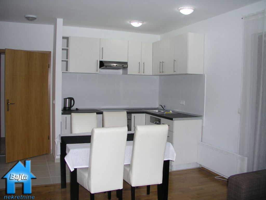 Jednosoban stan od 48m2 na prvom katu novogradnje južne orijentacije sa umirujućim pogledom na padine Čelimbaše (skijalište). Sastoji se od ulaznog dijela, kuhinje, blagavaonice sa dnevnim boravkom (sa dvosjedom na razvlačenje), jedne sobe sa bračnim krevetom , kupaonice, loggie i parking mjesta. Moderno namješten, klimatiziran, opremljen uređajima i namještajem visoke kvalitete, smješten u jednoj od najljepših zgrada sa lijepo uređenim okolišem, 200m udaljen od skijališta i 15km od autoputa. Mogućnost dugoročnog najma po cijeni od 1125kn (150EUR)za dvije osobe sa plačanjem režija. |