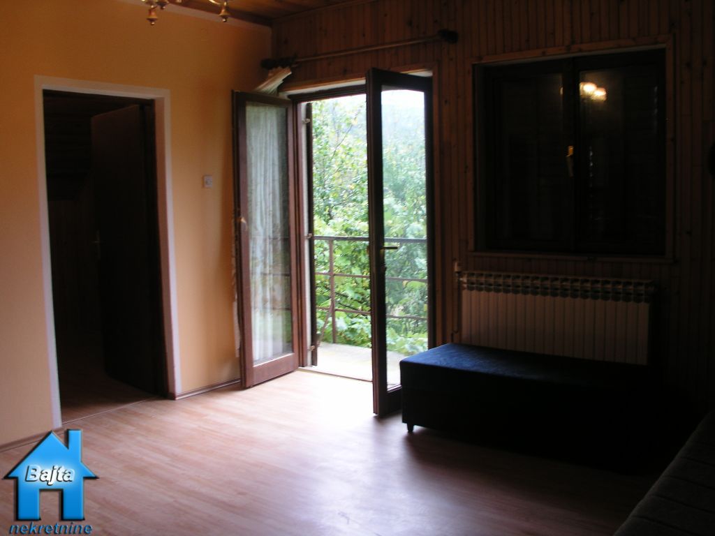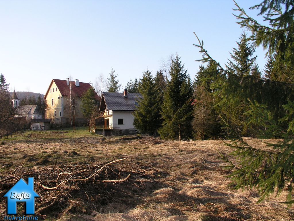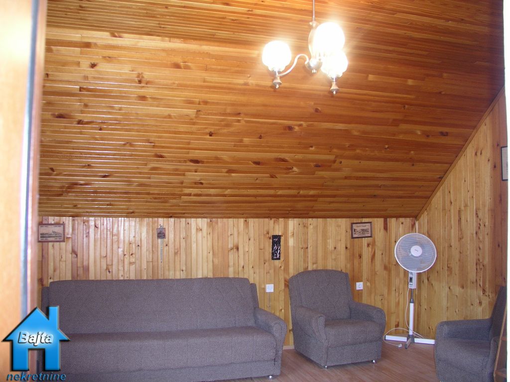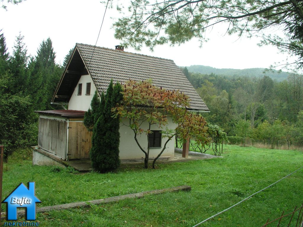 U manjem selu na mirnoj lokaciji, smjestila se kućica na livadi od 6000 m2.Sastoji se od dvije etaže,prizemlja i potkrovlja stambene površine 75 m2.U prizemlje se dolazi kroz veliku natkrivenu terasu i ulazi u veći degažman kroz kuhinju pa u dnevni boravak i drvenim stepenicama u visoko potkrovlje gdje se nalaze dvije spavaće sobe sa velikim balkonom.Sanitarni čvor je WC u prizemlju i kupaonica u potkrovlju.Provedeno centralno etažno grijane na kruta goriva.U prednjem dijelu vrta nalazi se velika garaža i drvarnica.Do vikendice vodi asfaltirana cesta koja se redovito čisti od snijega zimi.Parcela je djelomično oranica,djelomično livada i šuma.