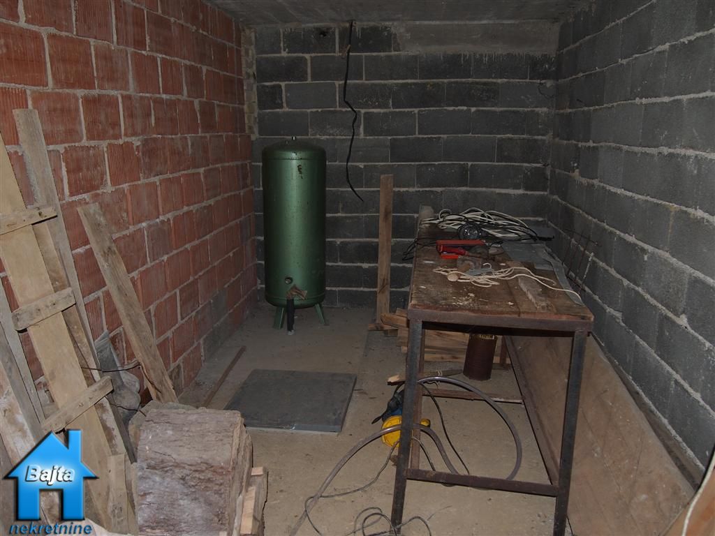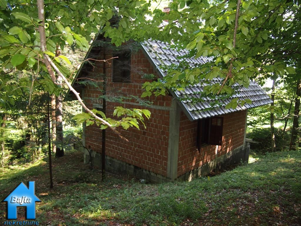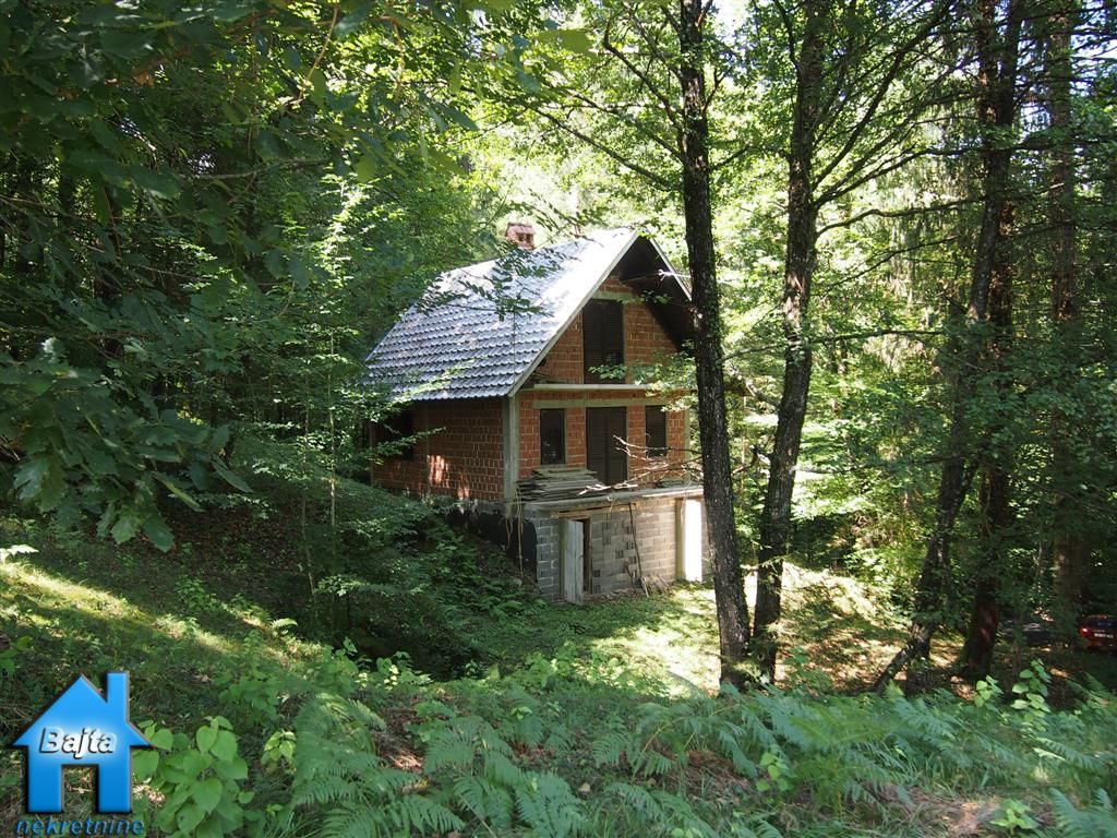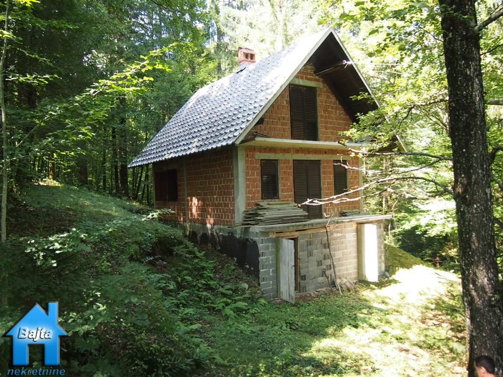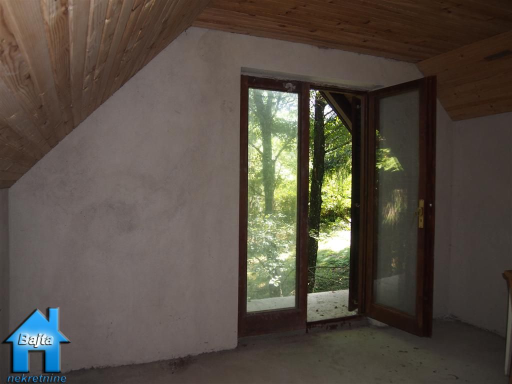 kupaonicu te mali hodnik koji drvenim stepeništem vodi do potkrovlja u kojem su smještene dvije spavaće sobe sa balkonom.U suterenu su dvije prostorije:jedna koja se koristi za garažni prostor i druga je spremište za alat ali i cisterna od 1000m3 punjena izvorskom vodom.Kroz sve etaže provedene su instalacije za struju i vodu.Cijelu priču krasi lijepi vrt od 2133m2 koji jednim krajem završava planinskim potokom ,a drugim visokim jelama koje ljeti rade ugodnu hladovinu.